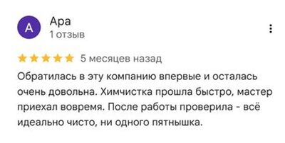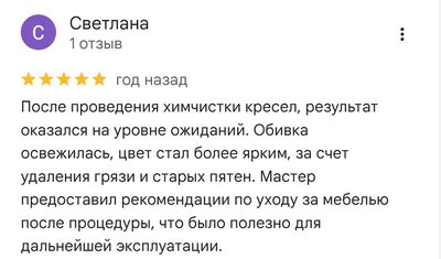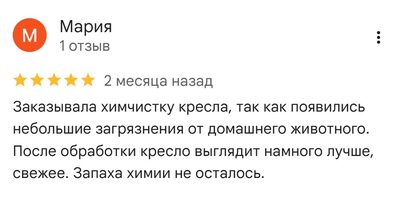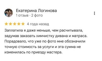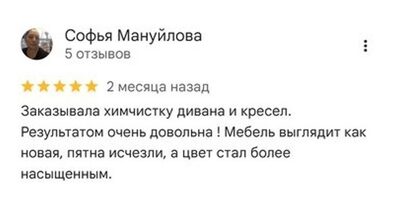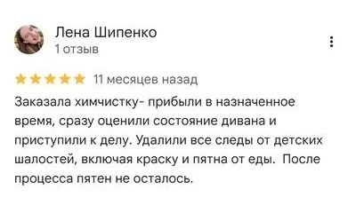 ".. мои родители уже пожилые, вся мягкая мебель в доме выглядела ужасно. Химчистка стала отличным подароком для них!"